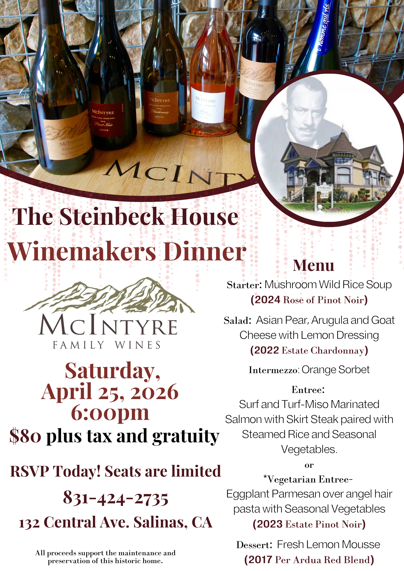 The Valley Guild was formed by eight enthusiastic women who shared a common interest in gourmet cooking and wanted to showcase the Salinas Valley produce. The Valley Guild renovated and restored the house after purchasing it. It was opened to the public as a restaurant on February 27, 1974 – the 72nd anniversary of John Steinbeck’s birth.