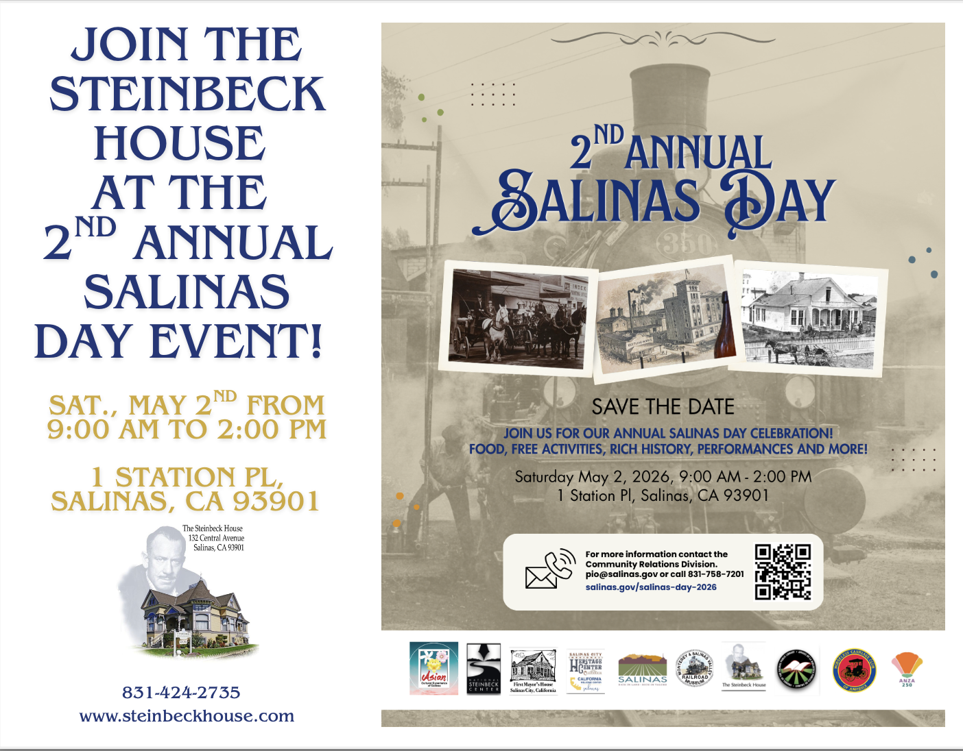 Join the Steinbeck House and fellow community partners for the 2nd Annual Salinas Day celebration on Saturday, May 2nd, from 9:00 AM to 2:00 PM!