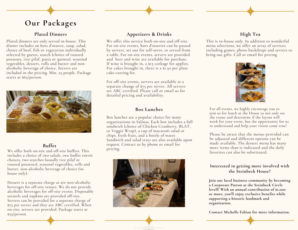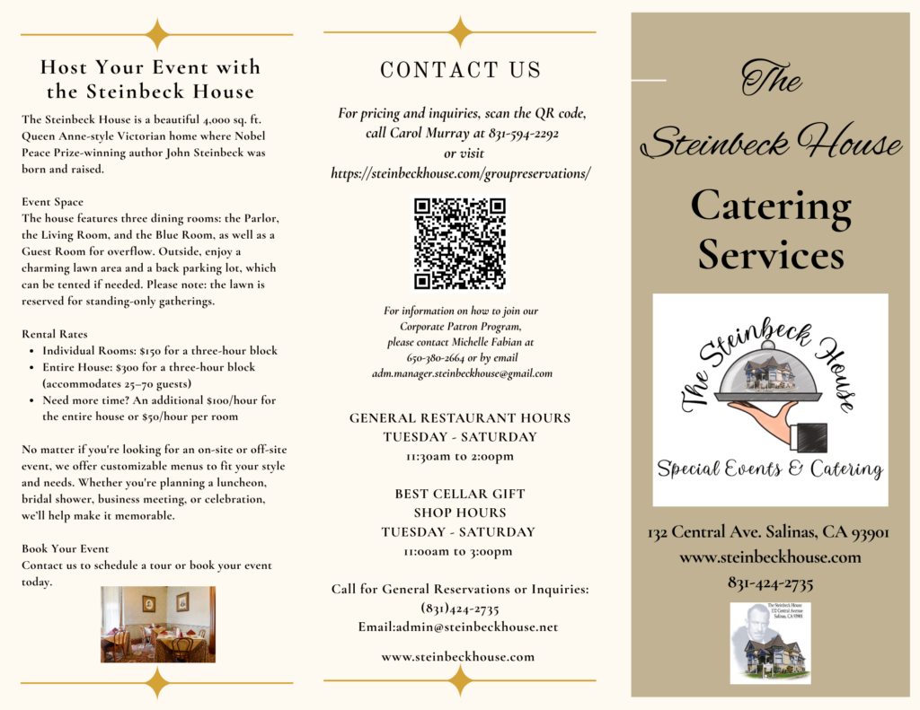 Whether you’re planning a special gathering or need catering for an off-site event, let the Steinbeck House make it memorable. Work with our event coordinator to create an experience your guests will enjoy and remember.